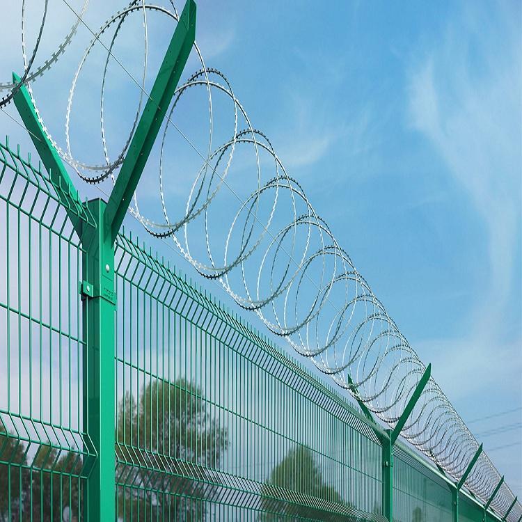 機(jī)場圍界網(wǎng)有以下幾個(gè)結(jié)構(gòu)組成:立柱、框架網(wǎng)片、v字形網(wǎng)片、熱鍍刺絲滾籠、斜撐、還有各個(gè)部分組成用的螺絲及配件,如果是臨時(shí)的機(jī)場護(hù)欄網(wǎng),除了以上的幾個(gè)部分外,還有底座槽鋼,方便移動(dòng)和安裝,臨時(shí)圍界多了底座槽鋼是為了方便安裝,槽鋼打孔、立柱底盤上打孔、直接把立柱用螺絲固定在槽鋼上即可、不用擔(dān)心穩(wěn)固性、底座是用8#熱鍍鋅槽鋼。