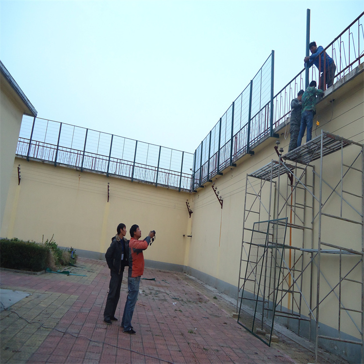 戒毒所鐵絲圍墻網帶應安裝防攀爬金屬隔離網墻。中度戒備監(jiān)獄周界圍墻內側7m、外側10m為警戒隔離帶,隔離帶內應無障礙,圍墻內側7m、外側10m處均應安裝一道總高度不低于4m的防攀爬金屬隔離網墻和蛇腹形刀刺網,網上應設報警設施。高度戒備監(jiān)獄圍墻內側10m、外側12m為警戒隔離帶,隔離帶內應無障礙,圍墻內側5m及10m處、圍墻外側5m及12m處均應各設一道總高度不低于4m高的防攀爬金屬隔離網和蛇腹型刀刺網,網上均應設視頻監(jiān)控、報警裝置。圍墻外側兩道隔離網之間應設置防沖撞設施施。