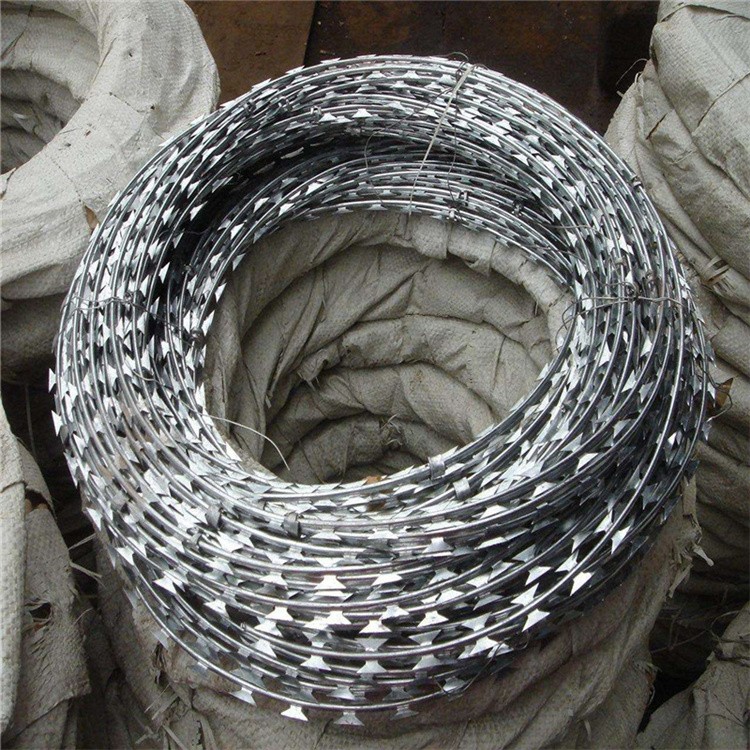 刀片刺繩屬于一種優(yōu)質(zhì)的阻絕措施,由不銹鋼板或者鍍鋅鋼板經(jīng)過沖壓刀型和芯線制成,芯線一般是由具有很大張力的鋼絲做成的,原材料的特性造就了刀刺網(wǎng)具有防破壞、防腐蝕等特點。刀刺網(wǎng)具有銳利的刀尖,所以從外觀上來看就給人一種恐怖的感覺。這種獨特的結(jié)構(gòu)賦予了刀刺網(wǎng)良好的防護(hù)功能,很多高安全場所、高級住宅區(qū)就是利用了刀刺網(wǎng)良好的防阻效果,將刀刺網(wǎng)普遍地安裝到了外圍墻上,使場地和住宅區(qū)的安全得到了保障。
