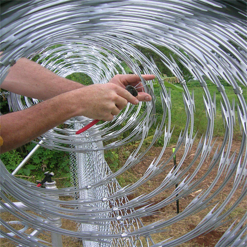 1、刀片滾籠采用刀片刺繩繞圈后相臨兩圈每隔120度用刺絲連接卡固定,張開后形成蛇腹?fàn)铋]合后刀剌繩圈徑為50cm,張開后每交叉圈安裝間距20cm,直徑不小于45cm。