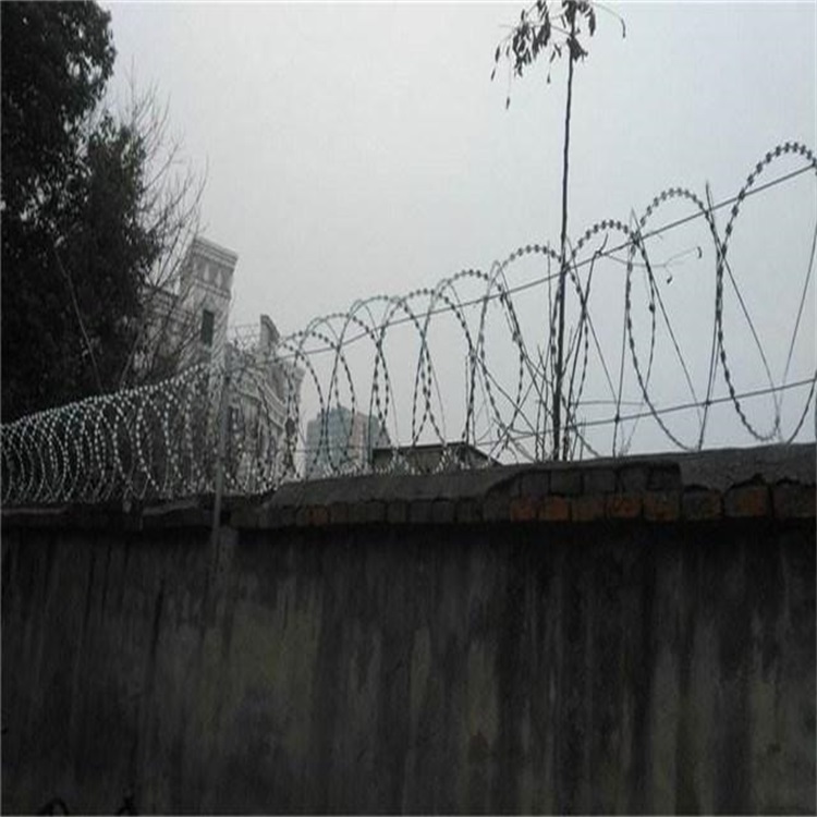 1、單獨使用時:主要是與混凝土實體墻結(jié)合使用,有專門配套的V型或者Y型支架,底部焊有法蘭盤打膨脹螺絲與墻體固定。支架上熔接鐵絲小勾卡槽用來固定鍍鋅絲,鍍鋅絲的作用是用來承托起蛇腹型刀刺,那U型卡扣與蛇腹型刺絲滾籠相連。因為每個支架的間距為2.5--3米,這中間如果沒有鍍鋅絲,刺絲滾籠會下垂,達(dá)不到理想安裝效果。