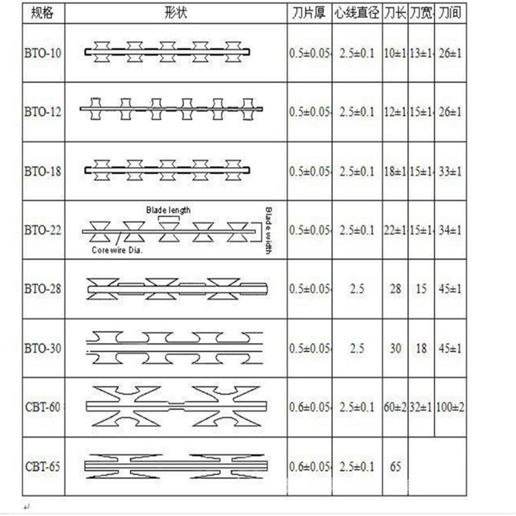 刀刺網(wǎng)安裝間距不宜少于250px,圈距排列應均勻,刀片形式宜為BTO-22(芯線直徑2.5mm±0.1mm,刀片厚0.5mm±0.05mm,刀片長22mm±1mm,刀片寬度15mm±1mm,刀片間距36mm±1mm),用于支撐刀刺網(wǎng)的支架伸出刀刺網(wǎng)長度不應大于50)mm;