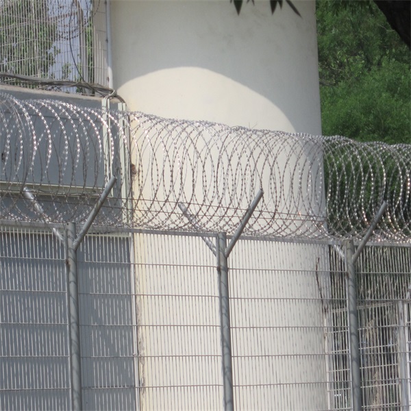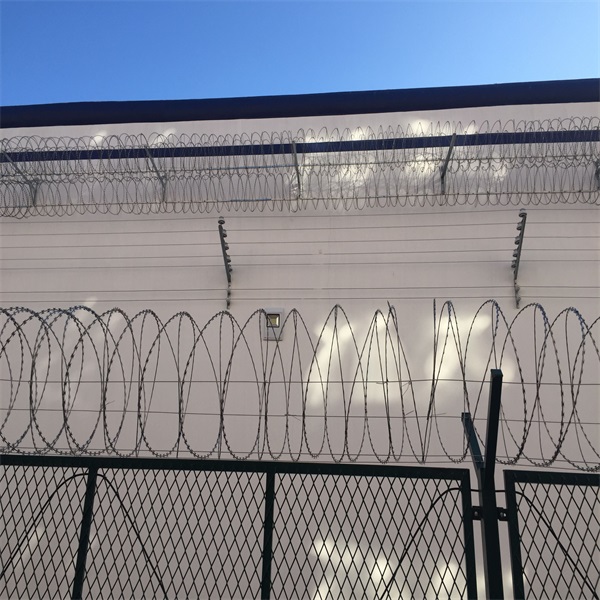 蛇腹型刀刺網(wǎng)在監(jiān)獄鋼網(wǎng)墻頂部的安裝注意事項(xiàng)∶1.將拉線展開拉直固定在立柱頂部的V形支架上,由于需要安裝的刀片刺絲有許多鋒利的尖刺,注意采取防護(hù)措施,以免傷到施工人員。2.刀片刺絲(直徑600mm )打開包裝,首先將一端固定在支架上后,按照螺旋順序展開,均勻分布間距控制在10圈/m,刀片刺絲與刺繩的交點(diǎn)處用綁線捆扎固定。3.檢查各連接部位是否連接牢固4.驗(yàn)收