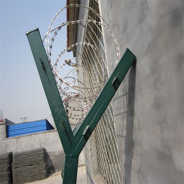 4、在刀片刺鋼網(wǎng)墻的Y字型支架的兩邊各拉一根鋼絲,對刺網(wǎng)進(jìn)行再固定,以免左搖右晃。刀片刺鋼網(wǎng)墻得收放∶刀片刺鋼網(wǎng)墻每2圈有3-7個(gè)卡扣,而且是圈圈相卡,拉開以后形成螺旋狀,拉伸的時(shí)候注意一定要帶防護(hù)手套,預(yù)防劃傷。拉開的時(shí)候只需要固定刺網(wǎng)的一邊,然后向相反方向拉開就行,注意孔的間距不要太大,不然影響美觀效果。收的時(shí)候只要慢慢的送回去就行,操作簡單,施工便利。