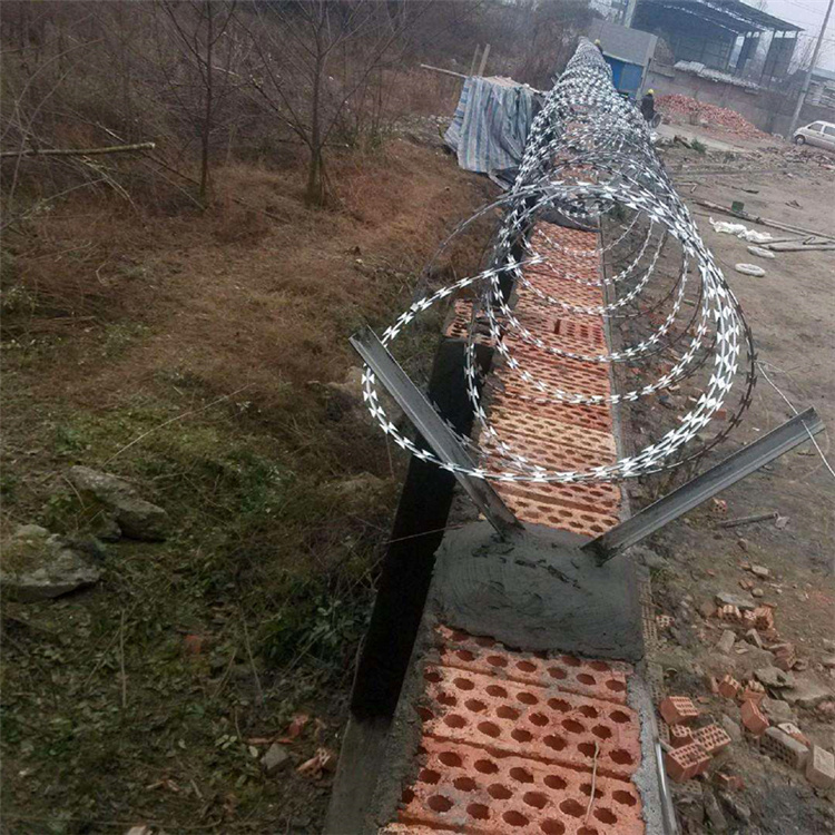 刀片刺網(wǎng),是一種防護、隔離能力較強的防護產(chǎn)品,采用優(yōu)質(zhì)鋼片沖壓尖刺包裹高強度 鋼絲壓制而成,雙線用卡扣銜接固定,呈現(xiàn)螺旋型,既美觀又讓人不寒而栗,起到了很好的 阻嚇作用。已被廣泛用于軍事重地、監(jiān)獄、政府機關(guān)、銀行、生活小區(qū)圍墻、私人住宅、別 墅圍墻、鐵路柵欄加高以及邊境線等的安全防護??梢栽趪鷫ι蠁为毷褂?,也可以搭配隔離 網(wǎng)在頂部架設(shè)。