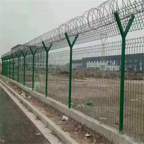機(jī)場(chǎng)護(hù)欄網(wǎng)一般采用5.0mm的優(yōu)質(zhì)低碳鋼絲焊接;網(wǎng)孔(mm) 50x100 50x150 50x200網(wǎng)片中帶有Y型加強(qiáng)筋可增強(qiáng)護(hù)欄網(wǎng)的抗沖擊力。立柱為60X60矩形鋼,頂端含有Y型支架,網(wǎng)片連接采用熱鍍鋅螺絲或不銹鋼螺絲,有效防止人為破壞性拆卸,產(chǎn)品均為熱鍍鋅后采用高質(zhì)量的聚酯粉末靜電噴涂,采用國際流行的RAL顏色。