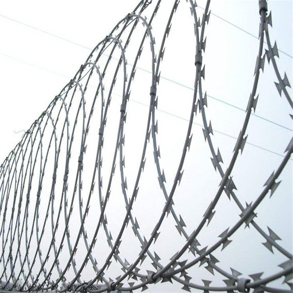 鋼絲做芯線組合而成的。鋒利的刀型刺由雙線扣裝后成蛇腹狀,既美觀又讓人不寒而栗?!銜钆?0mm方管,壁厚在2-2.5m,高度2.4米,底部2米圍直線,上部0.4米向內(nèi)折30度成斜線,立柱間隔為3米,橫粱采用40*2mn長方鋼,長3米為一個單位,菱形孔刀片刺網(wǎng)和螺旅狀刀刺網(wǎng)組成完美的鋼網(wǎng)圍墻。