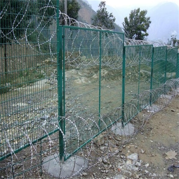 山地圍欄網(wǎng)頂部可加裝螺旋刀刺網(wǎng)或刺絲,加強(qiáng)防護(hù)等級(jí)。